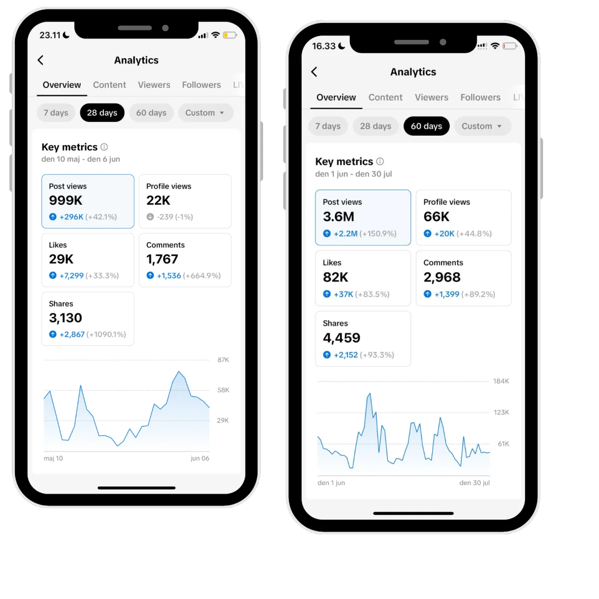 Vi fokuserer på at skabe målbare resultater, såsom øget engagement, flere følgere, højere visninger og bedre konverteringsrater. Vi følger nøje op med rapporter og analyser for at dokumentere væksten og tilpasse strategien efter behov.